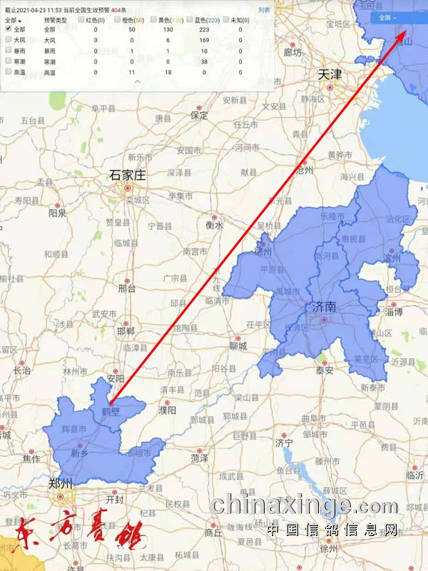 赛线示意图(蓝色区域为大风预警)