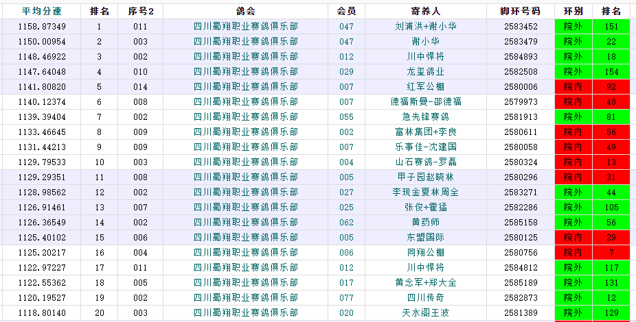 综合成绩方面,院外47号棚包揽总冠军、总亚军,刘浦洪+谢小华的2583452赛鸽,飞出1关222名、2关季军、3关18名、4关225名,以1158.87349米/分的平均速度获得四关鸽王总冠军。47号棚谢小华的2583479赛鸽获得四关综合总亚军,飞出1关137名、2关66名、3关82名、4关33名,平均分速为1150.00954米/分。