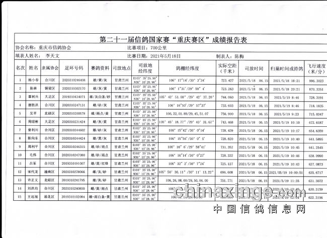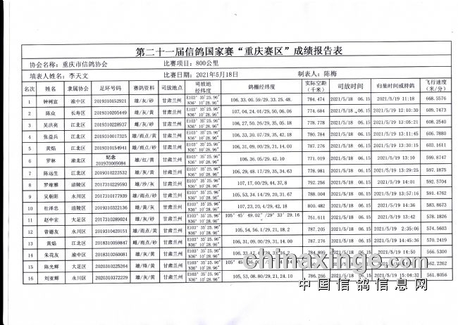 本次比赛由重庆市鸽会副会长杨国华同志现场指挥,已于18日早上6点15分在兰州司放,放飞地坐标:N36°10′28.96″,E103°35′25.96″,来自21个区县的2135羽赛鸽参赛。这必定又是一场精彩绝伦的赛事盛宴。