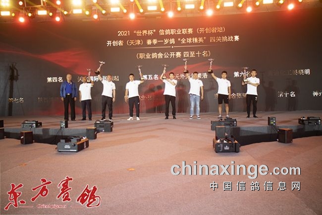 北京海峡两岸鸽友联谊会会长——孙宏信为荣获职业鸽舍公开赛4——10名鸽友颁奖。