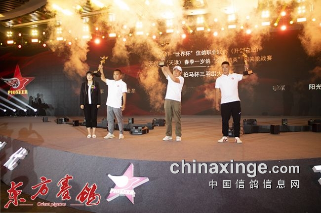 中国信鸽协会秘书长——王佳鑫为获得“伯马杯”大奖赛季军——阳光开尔徐应捷、亚军 ——张金泉、冠军——杨世杰颁奖。