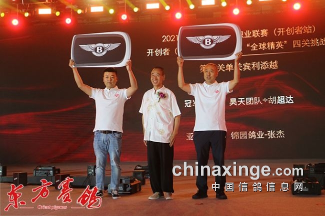 嘉宾诚鸣拍卖团队著名拍卖师——周传红为获得第一关宾利添越汽车大奖赛的鸽友,冠军——昊天团队+胡超达、亚军——锦园鸽业一张杰颁奖。