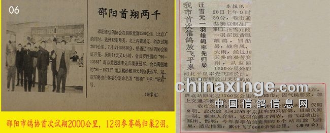 湖南邵阳市鸽协首次试翔2070公里内蒙通辽,仅12羽赛鸽参赛,于当年7月17日8时30分在通辽开笼,历经14天零4小时首羽归巢,鸽主罗胜强的环号为【90-13356】雨黄雄鸽获冠军。禹强雄的【90-15715】雨点桃花雌鸽18天归巢荣获亚军。(见资料图06左)