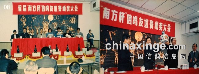 首届“南方六省市信鸽联翔”审品评颁奖大会、定在广州市省体委会议厅举行。广东省省委副书记张帼英出席了这次颁奖会,出席本届颁奖大会的领导还有:广东省体委正、副主任;群体处长、体育总会领导及五省(市)体委领导、代表和裁判员。颁奖会结束前广东省体委主任将南方杯交给下届承办单位湖南省信鸽协会,湖南省信鸽协会主席伍良志接杯,跨省信鸽联翔成功。(见图08)