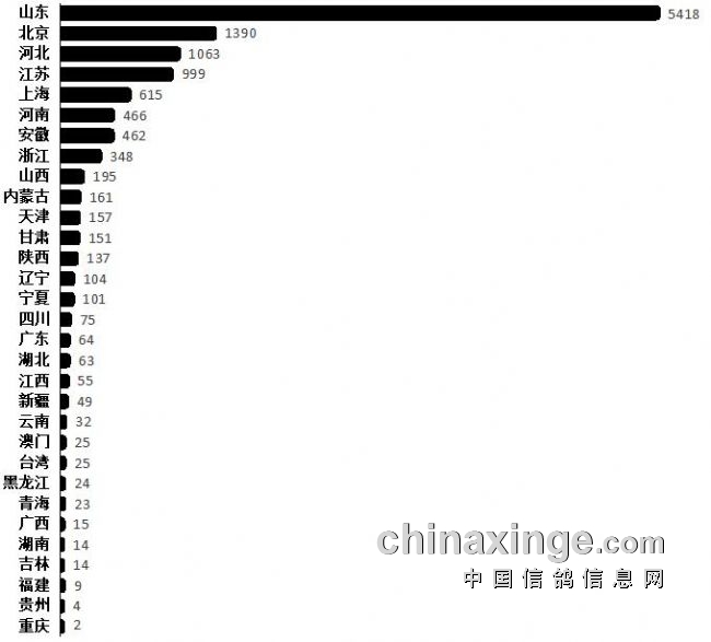 从交鸽省、区(直辖市)的分布看,最北面的黑龙江和内蒙古,最南的台湾和广东,最西的青海和新疆,除西藏、海南、香港之外有31个省、直辖市、自治区或特别行政区都有鸽友交鸽;交鸽超过100羽的河北、北京、江苏等15个省市,主要集中在以曌一公棚大本营山东为中心的华东和华北及西北地区。首届收鸽就能有如此大范围的影响力和感召力是十分罕见的,但也说明,酒香也怕巷子深,曌一在距山东较远各地区的影响力仍有较大提升空间。