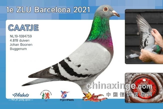 法国鸽友本·罗伯特(Ben Robert)的一羽环号为FR2016-187003雨点雄鸽,于22点18分报进,飞行空距1043公里,分速为1118米/分,后来居上,拿下2021年巴塞罗那千公里国际冠军、法国全国冠军。这位法国鸽友曾在2004年获得法国巴塞罗那冠军、国际5名,那羽冠军鸽“超极本”当年以创纪录的价格卖给了日本鸽友。今年的国际总冠军也是这羽“超极本”的后代鸽,有荷兰万德维根、尼可沃肯斯等长距离老品系的血脉。