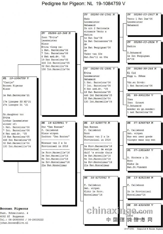 它的母亲来自比利时弗朗索瓦·卡利博鸽友,他们之间通过一羽天落鸟取得的联系。弗朗索瓦抓到了一羽约翰的一羽幼鸽天落鸟,不过他把它放飞了。天下鸽友是一家,作为感谢,约翰送给他几枚鸽蛋。不久之后,弗朗索瓦将他鸽舍中最好的长距离赛鸽“德邦腾”(de Bonten)的一羽幼鸽,作为回礼送给了约翰。也许这就是鸽缘,冠军鸽的母亲就是这羽幼鸽,现在仍然在约翰的种鸽舍内。令人惊讶的是,约翰并不知道弗朗索瓦住在哪里,只是有他的电话号码而已。