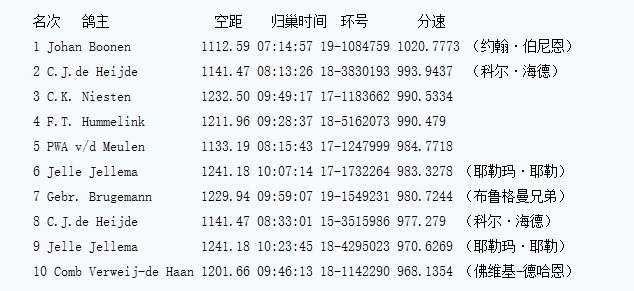 7月12日,荷兰全国报到超1100羽,空距几乎均在1100公里以上,1300公里以上有6羽,最远为1339.760公里。在荷兰全国前十名榜单中,多位名家榜上有名: