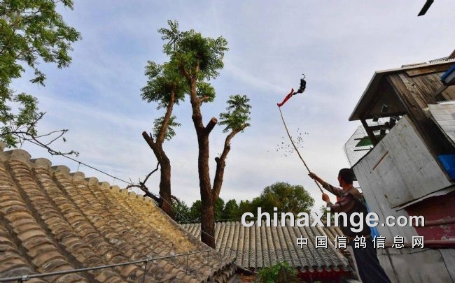 邹立明每天早晚两次把鸽子赶到院子上空盘旋。只见他手持挂着红布黑布的竹竿将鸽子轰上天,心满意足地指挥着鸽群随着自己手上的动作忽东忽西、忽上忽下。