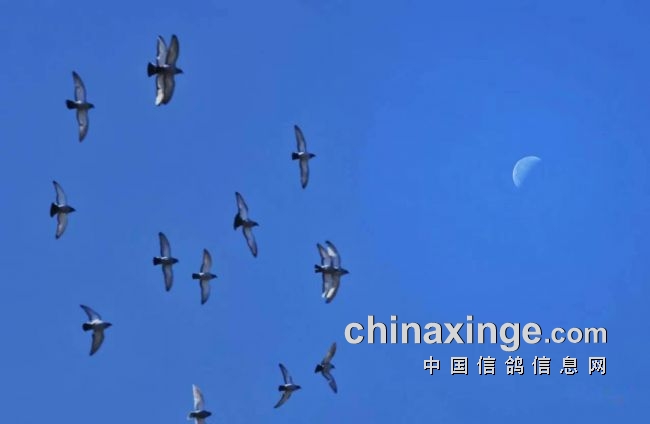 清晨,邹立明的鸽子掠过弯月。盘鸽子,24只鸽子叫一拨,盘鸽子至少得在两拨以上。早上打开鸽子窝放出鸽子叫起盘,几拨摆着阵势在天空中列队飞翔,这样的风景北京独有。