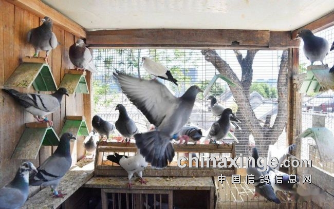 鸽棚内有近百羽鸽子,花色品种各不相同。