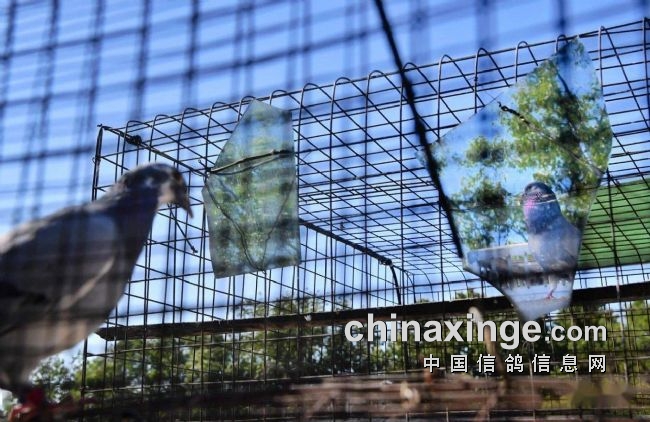 邹立明在鸽棚的铁丝网上绑上了两块碎玻璃以方便观察刚刚学习飞翔的雏鸽子状况。