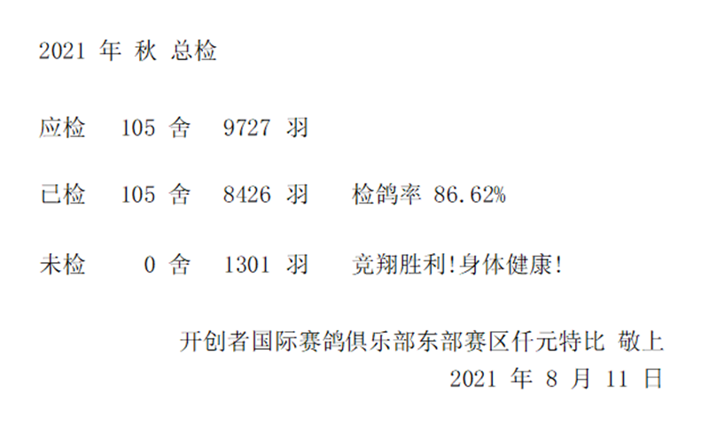 截止8月11日上午11点50分,共有105舍8426羽参赛鸽完成总检并确认为有格参赛鸽,最后在北京市信鸽协会裁判和鸽友代表的共同见证下,对2021年开创者“铁鹰四关”北京东部赛区仟元特比环比赛注册专用印章进行了当众销毁。