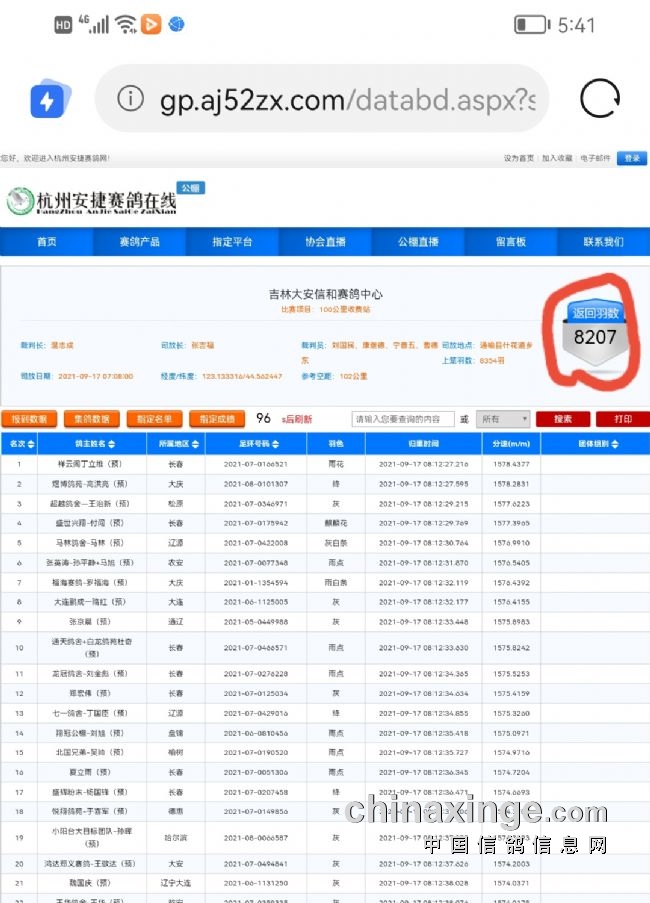 截至当日18时许,共归巢8207羽参赛鸽,当日归巢率高达98.24%,完美地诠释了吉林省大安信和公棚的养功非常好!