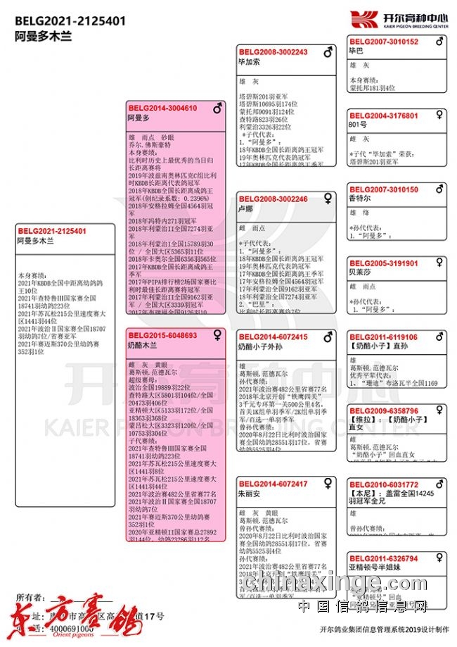 2021年KBDB全国中距离幼鸽鸽王10位:环号BELG2021-2125401,“阿曼多”直系子代,父亲:“阿曼多”BELG2014-3004610,母亲:“奶酪木兰”BELG2015-6048693。这羽传承了黄金血脉的年轻悍将表现神勇,是带领开尔征服欧洲战场的第一功臣。