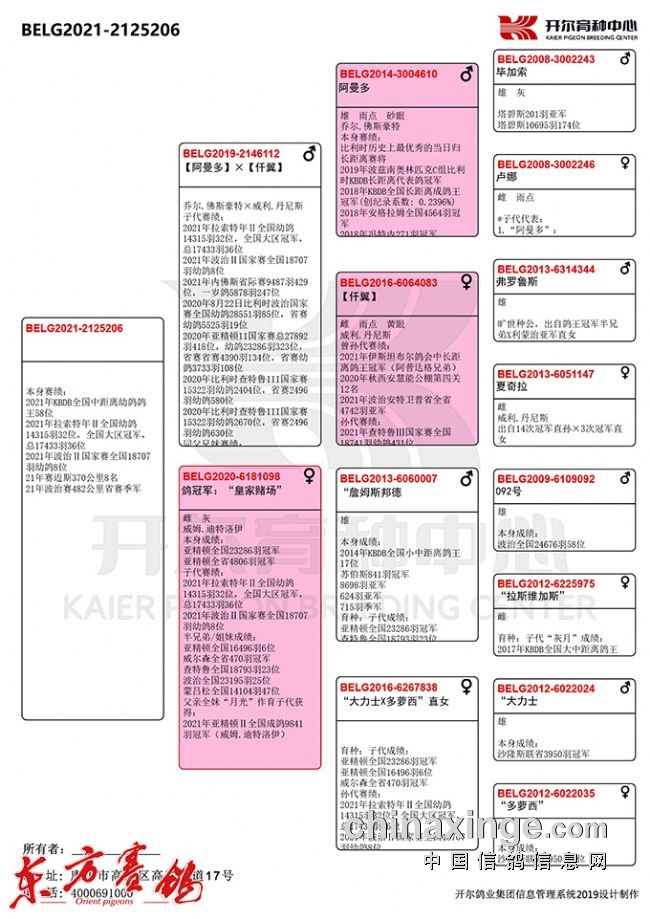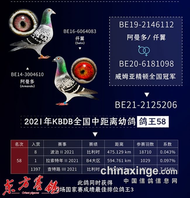 2021年KBDB全国中距离幼鸽鸽王58位:环号BELG2021-2125206,“阿曼多”孙女,父亲:“阿曼多X仟翼”BE19-2146112,母亲:“皇家赌场”BE20-6181098(2020年亚精顿幼鸽组23286羽荣获冠军)作出。这羽强强联姻作出的小将,是和他的叔叔BELG2021-2125401不相上下的竞飞强将,其获得: