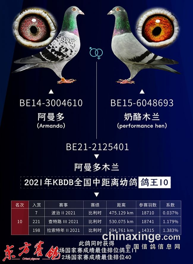 本年度阿曼多系新晋2021年KBDB全国中距离幼鸽5羽鸽王,事实胜于雄辩,也进一步证明了阿曼多是传奇中的传奇。