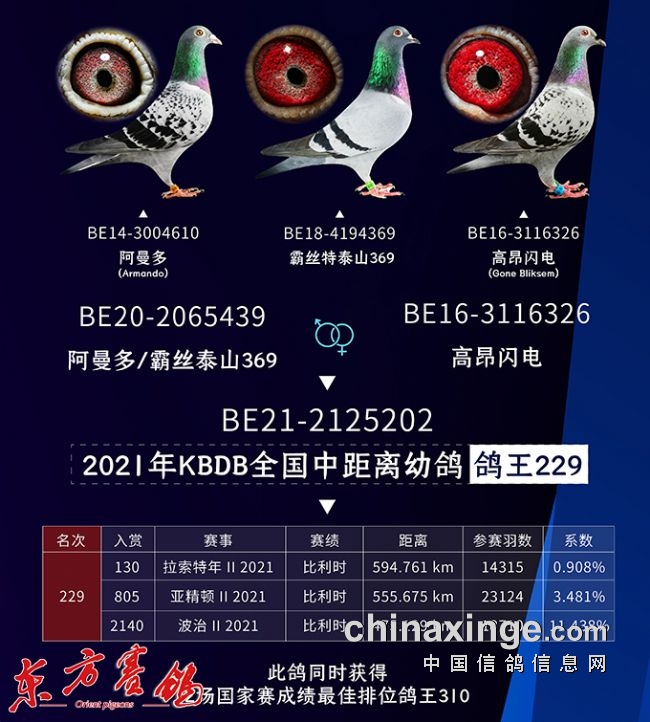 2021年KBDB全国中距离幼鸽鸽王229位:环号BELG2021-2125202,“阿曼多”孙代,父亲:“阿曼多X霸思泰山369”BELG2020-2065439,母亲:“高昂闪电”BELG2016-3116326作出。