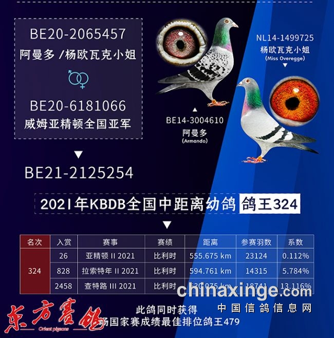 鸽王324位:环号BELG2021-2125254,“阿曼多”孙代。