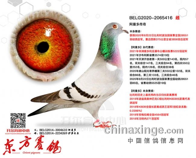 2020年阿曼多直女——阿曼多传奇环号BELG2020-2065416首次亮相欧洲赛场,一举拿下比利时波治国家赛全国幼鸽28551羽亚军,塞迈西斯375公里全省3856羽总冠军。