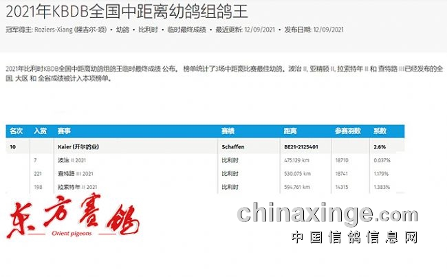2021年KBDB全国中距离幼鸽组鸽王最终成绩于09月15日公布,榜单统计了3场中距离比赛最佳幼鸽。波治Ⅱ、亚精顿Ⅱ、拉索特年Ⅱ和查特鲁Ⅲ已经发布的全国、大区和全省成绩被计入本项榜单。
