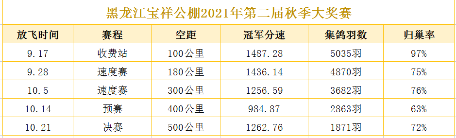 黑龙江宝祥赛鸽公棚2021年秋季赛事于10月21日谢幕,本次比赛集结河南、河北以及黑吉辽三省等多地精英,近一月激战后,鸽主S李国胜+周全+刘辉(预)的一羽2021070255995J灰鸽突出重围,同时夺得精英赛冠军;而决赛亚军S福城阳光(预)同时也是汽车赛500公里冠军。鸽主S于洪章(预)的一羽2021-08-0322358灰鸽接连夺得双关、三关鸽王冠军。