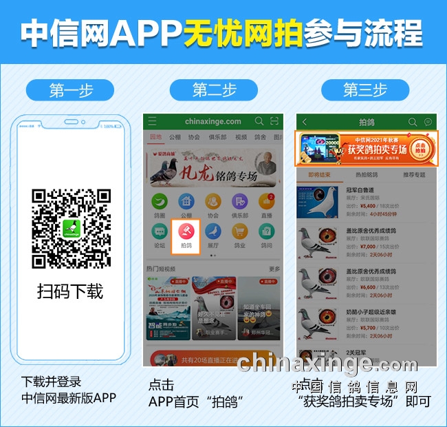 现在,600羽精兵强将正静候其主,11月6日,公棚联合中国信鸽信息网开启“无接触智能网络拍卖服务”,所有鸽友可使用电脑或手机登录中信网,并同步出价,享受足不出户参与竞拍的便利和刺激!