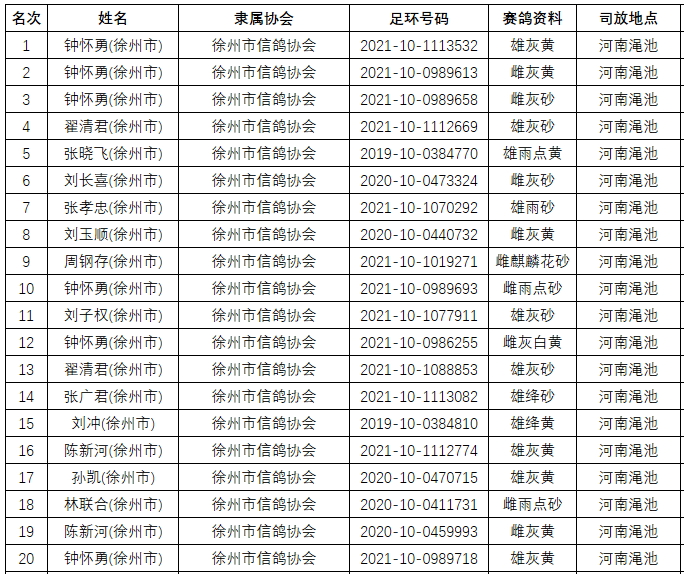其中南京市2499羽信鸽参赛、无锡市515羽信鸽参赛、徐州市1699羽信鸽参赛、常州市1321羽信鸽参赛、南通市5330羽信鸽参赛、连云港市1558羽信鸽参赛、淮安市895羽信鸽参赛、盐城市1918羽信鸽参赛、扬州市1534羽信鸽参赛、镇江市775羽信鸽参赛、泰州市1328羽信鸽参赛、宿迁市5564羽信鸽参赛。