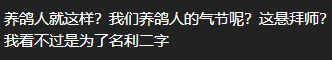养鸽之事,说到底也只是一场娱乐,怡情而已。即便其中名利再诱人,但生命中珍贵的东西比如尊严、良知,我们还是应该坚守,否则养鸽意义何在?为了跪拜别人,或有朝一日让人跪拜?此举实在不利于正常、健康的养鸽氛围的打造。