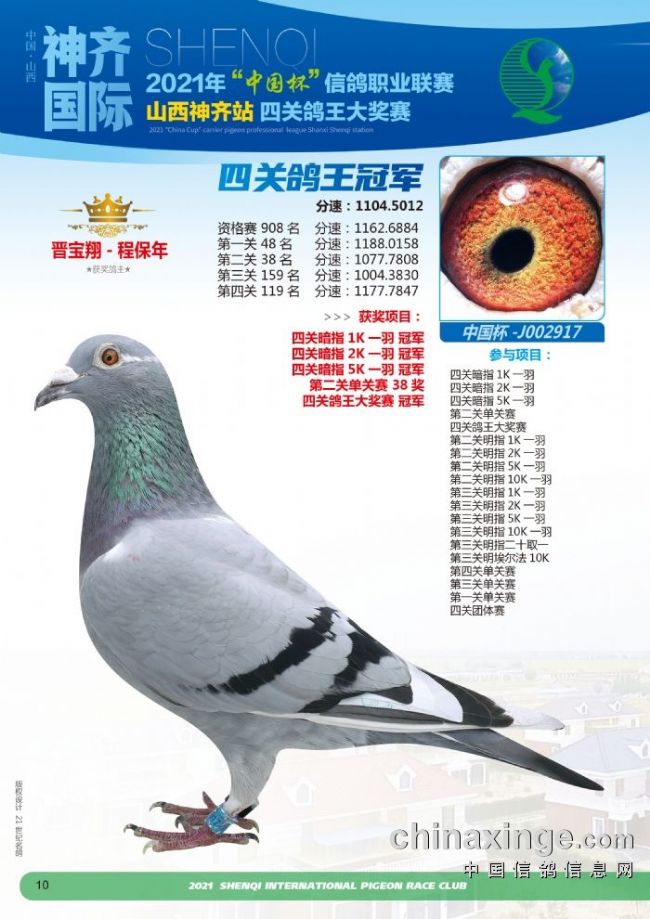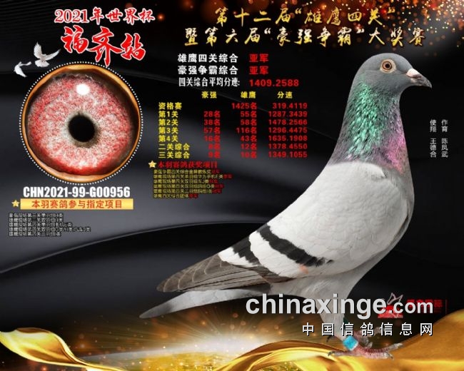6.唐山阳光赛鸽俱乐部2021年职业四关鸽王赛,集结了国内众多赛鸽强豪,竞争激烈,过程刺激。鹏程万里团队麾下华雨鸽舍-谢卫华的三羽战将晴天快、雾天稳,包揽了四关鸽王冠军、亚军、季军。
