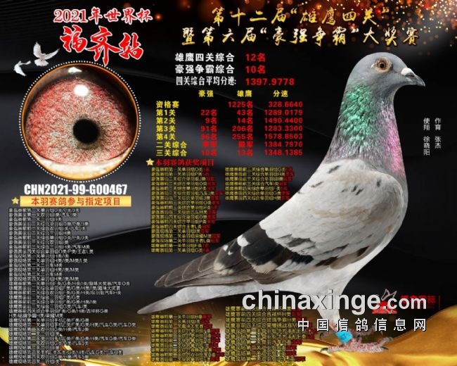 徐晓阳使翔,西北名家张杰作育的这羽467号,前两关战绩超好,获得强豪杯22、9名,后两关略微后劲不足,但依然在强豪杯的百强之内,分别获得91、96名,最终获得雄鹰四关鸽王12名、强豪争霸鸽王10名。此鸽显然是鸽主的主力战将,对它信心十足,四关比赛打下多项指定,赢得丰厚的奖金。