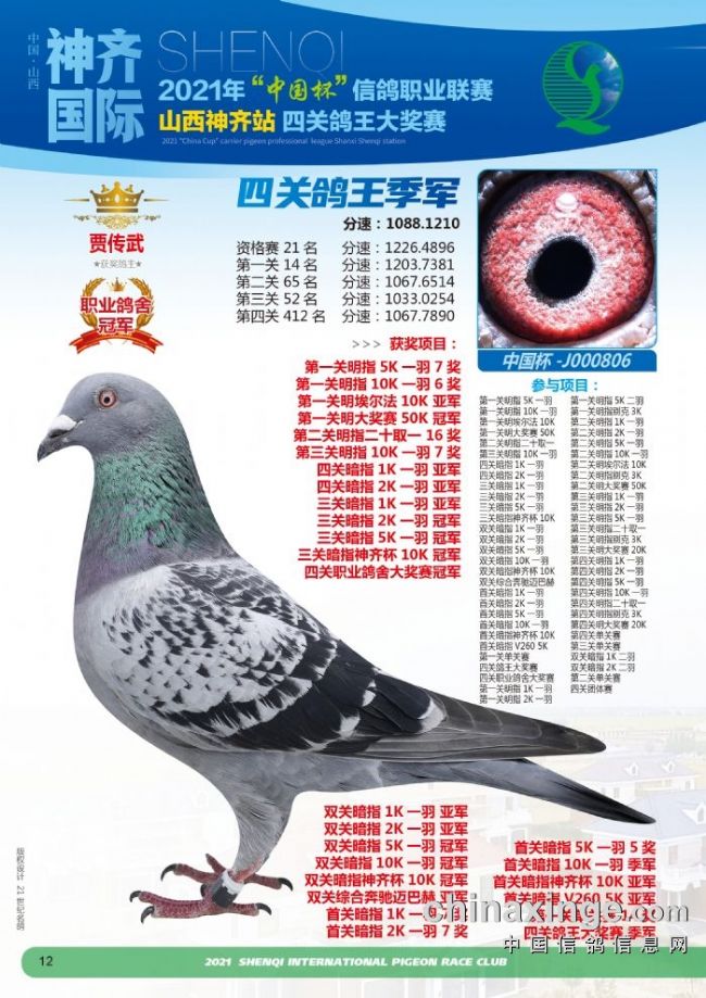 贾传武的这羽0806雨点是四关综合鸽王总季军、职业鸽舍总冠军,拍出了山西神齐今年的全场最高价。这羽鸽王季军,砂眼雨点,四关排名分别是1关14名、2关65名、3关52名、4关412名,同时也是双关综合总季军、三关综合总亚军,综合成绩从未跌出前三,实力超群。据鸽友报料,此鸽的成交价应该是2021秋季赛事中,所有获奖鸽的“标王”。