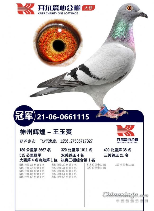 2.开尔爱心公棚大棚,国内公棚独一档,在这里夺冠,一朝成名天下知!而神州辉煌—王玉爽在这里连续三年杀入决赛前三甲,可谓“名利双收”。这羽1115号黄眼灰鸽前两关短距离速度赛紧随大部队归巢,后两关上距离、加难度的情况下越战越勇,获得400公里35名、515公里决赛冠军,还是三棚联翔总冠军,同时拿下双关鸽王殿军、三关鸽王21名的头衔。名人名鸽名血,战绩还彪悍,肯定是大家竞相争夺的对象,果不其然,最终也是拍出了一个天价,成为今秋的“榜眼”。