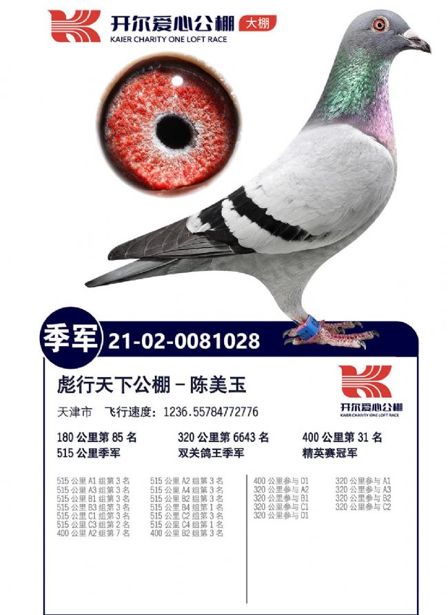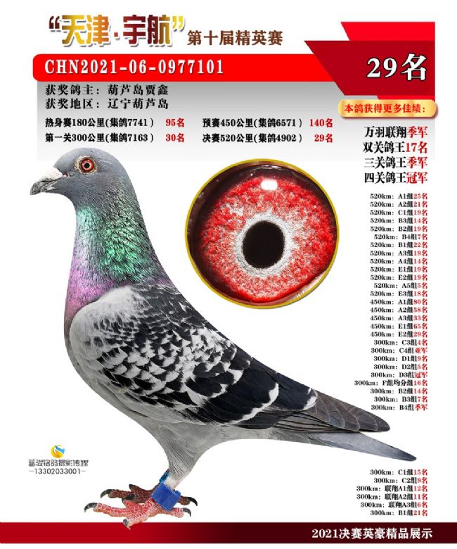 葫芦岛贾鑫的2021-06-0977101雨点鸽四关皆优,获得热身赛95名、一关30名、预赛140名、决赛29名,赢得三关鸽王季军、四关鸽王冠军。这羽冠军,也成为了天津宇航公棚的“标王”。