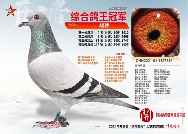 5.北京开创者赛鸽俱乐部,今年分为东、西、北三个赛区,其中东西两赛区大牌云集,竞争最为激烈。郝建的7812黄眼小灰飞了四关比赛,两进前十名,最终拿下东部赛区双关鸽王亚军、三关鸽王冠军、四关鸽王冠军。战绩彪悍,价值自然水涨船高,成为开创者今年的标王。