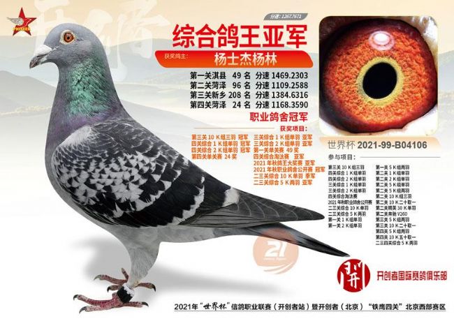 西部赛区,赛鸽名家杨士杰、杨林的“4106号”雨点黄眼战绩分别是一关49名、二关96名、三关208名、四关24名,获得四关鸽王亚军、职业鸽舍冠军。