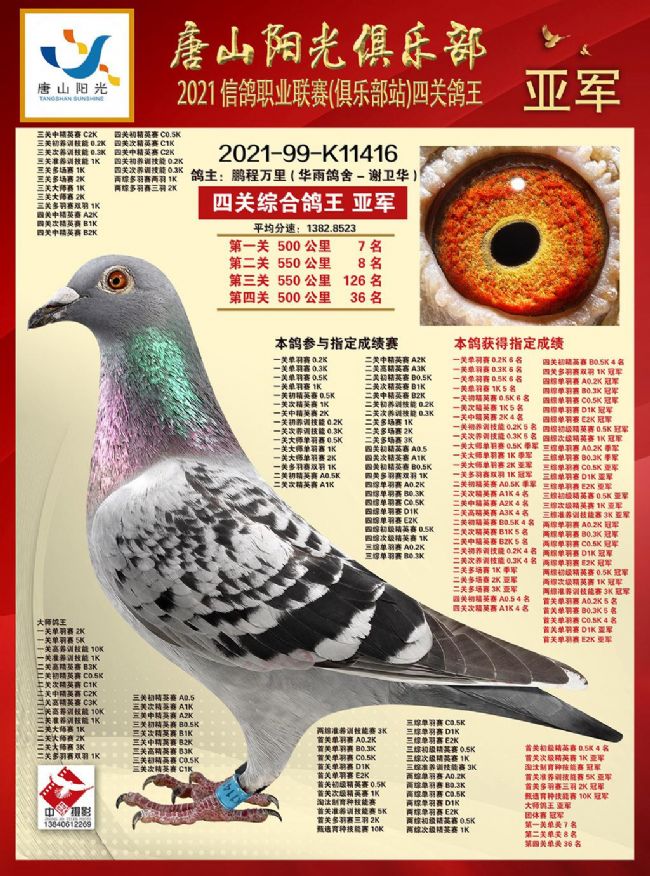 “11416”,这羽黄眼雨点鸽一点都不比鸽王冠军差,名次甚至更好,获得一关7名、二关8名、三关126名、四关36名,以1382.8523米/分拿下鸽王亚军。