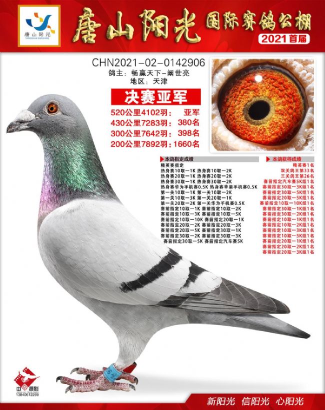 7.唐山阳光赛鸽公棚今年虽是第一年举办比赛,但备受鸽友关注,收鸽众多。200公里7892羽赛鸽起站,至500公里决赛上笼4102羽,畅赢天下-阚世亮的2021-02-0142906灰鸽首关热身,随后两关紧跟第一集团归巢,决赛冲到最前面,仅落后15秒钟,屈居亚军,但拿下精英赛冠军,赢得多项指定成绩。查看飞行轨迹,决赛一战几乎直线归巢,定位能力出众!
