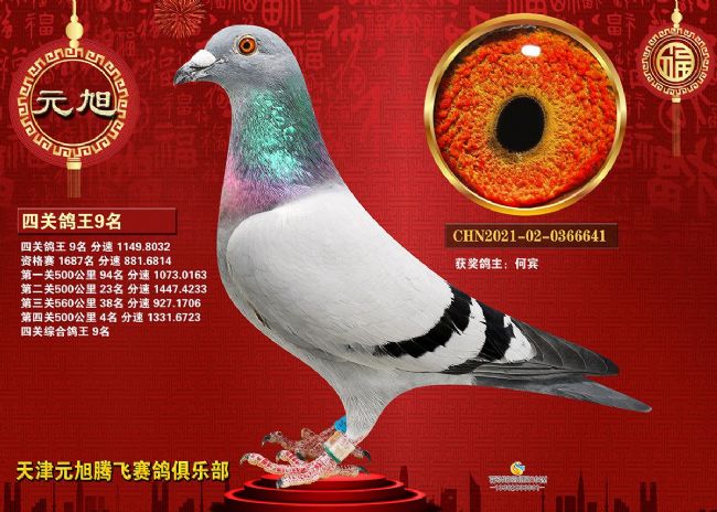 12.天津元旭腾飞赛鸽俱乐部,今年举行仟元四关鸽王赛,四场500公里级别的赛事,有一定难度。天津赛鸽名家何宾的2021-02-0366641黄眼灰鸽越战越勇,关关递进,飞出了超强战绩,一关94名、二关23名、三关38名、四关殿军,四关鸽王九名。名人、名鸽、强将,高价成交也是必然。