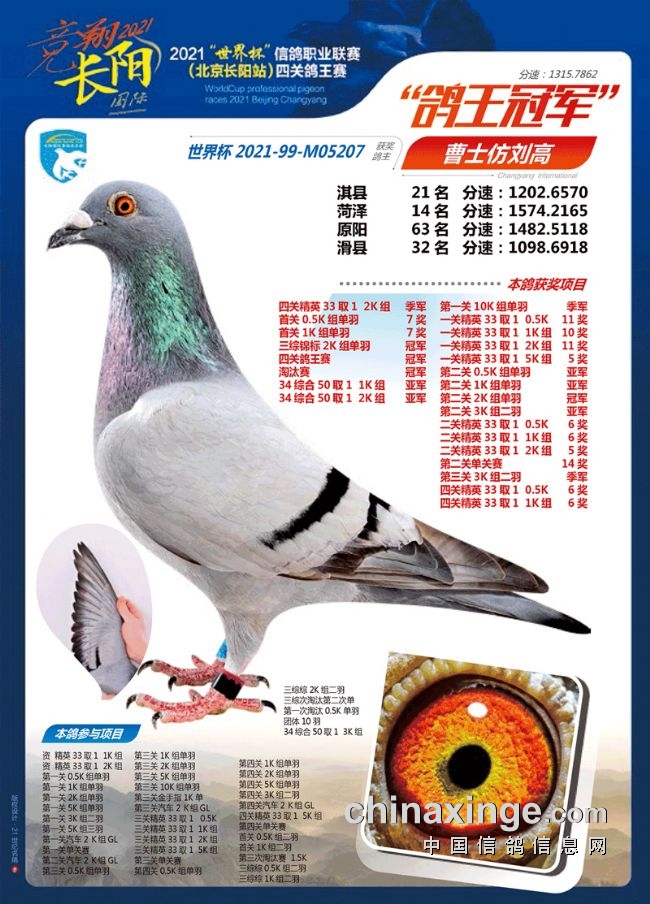 11.北京长阳国际赛鸽俱乐部,是著名的京城职业赛场之一,除了北京名家之外,还汇聚了各地的赛鸽强豪。在今年艰难的比赛中,长阳国际四关稳稳当当,飞出了许多好成绩。北京名家曹士芳、刘高的05207黄眼灰鸽四关均在百名之内,获得一关21名、二关14名、三关63名、四关32名,获得四关鸽王总冠军,是长阳赛场最耀眼的明星,也是今年长阳的“标王”。