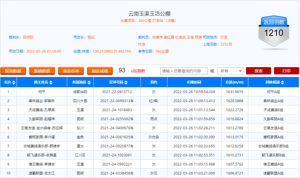 谁知在接下来的220公里预赛,这羽赛鸽双翅疾展,拿下第一名,分速1357.2248米/分。
