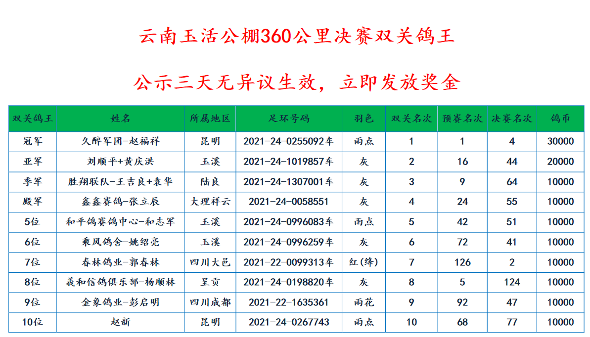 预赛冠军、决赛4名,双关鸽王冠军。