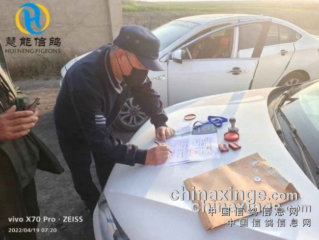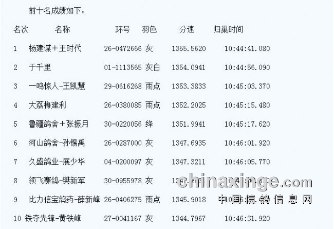 当现场鸽友沉浸在轻松欢乐之中时,公棚突然响起鸽哨声,鸽子到了,大家抬头看见一群鸽子飞进视野,很快有鸽子迅速落棚,通过扫描,大屏幕显示出了成绩,杨建谋+王时代26-0472666灰1355.5620米/分速夺得冠军;于千里01-1113565灰白1354.0941米/分速获得亚军;一鸣惊人-王凯慧29-0616268雨点1353.3833米/分速获得季军。