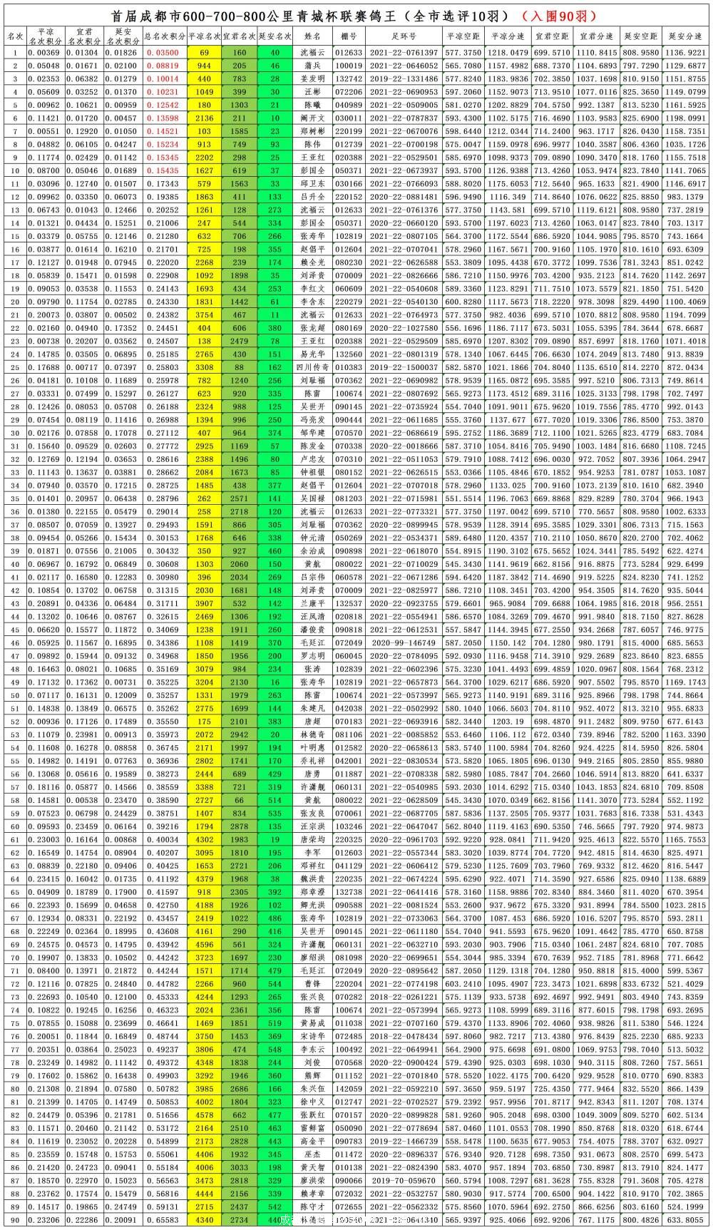 2022年成都市首届春季600+700+800公里三次大联赛综合鸽王评比今日出榜揭晓,全市共计90羽超级赛鸽榜上有名,为主人夺得至尊荣誉。