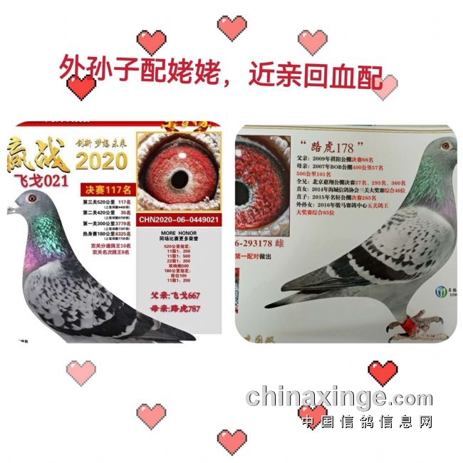 去年,也搞了一对外孙子x外祖母的回血配对,雄鸽:飞戈021,雨点单侧白条,本身公棚预赛飞35名、决赛117名,双关名次鸽王八位;雌鸽:路虎178,配4羽雄鸽都作出入赏鸽,是飞戈021的外祖母,去年出了-对双雌,我将大雌送给一位鸽友了,小雌我留下了,非常可惜,小雌去年冬季得新城疫死掉了,给朋友的那只大雌今年出子代已经送公棚了,秋季看效果了。