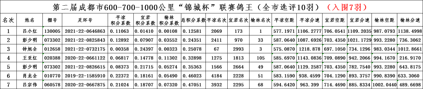 今年联赛参赛数量大(600公里全市18702羽、700公里12286羽、1000公里929羽),各场比赛归巢率和分速均为近年来最好,要在如此激烈争夺中夺得鸽王头衔实属不易。最后当选第2届成都市鸽协“锦城杯”鸽王的7羽超级鸽是:
