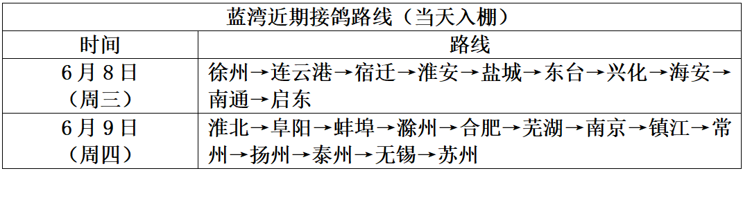 值得注意的是,两个棚都将于6月18日结束收鸽,6月19日至30日只接受已交鸽会员补组,7月1日后不再接受任何形式的交鸽。这也不难理解,对于上海来说,7月的入棚鸽较难适应秋赛,像蓝色海湾这样经验丰富的公棚,当然不可能拿自身声誉冒险。据悉,6月8日、9日,蓝湾接鸽团队将前往江苏、安徽全省接鸽。