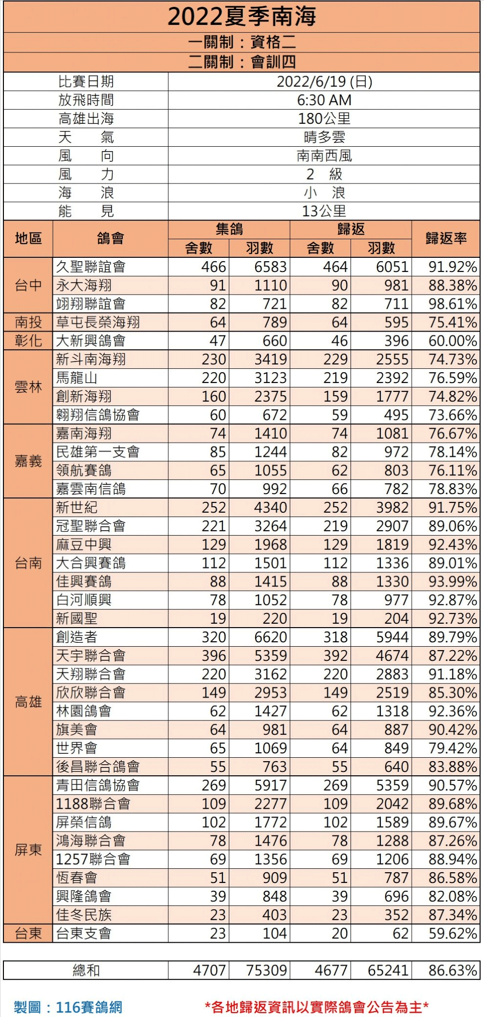 2022年中国台湾南海夏季海翔五关鸽王赛第二场资格赛,于6月19日早上6点30分开笼放飞,晴间多云天气,南风、西南风2级,小浪,能见度13公里,空距距离高雄港180公里。 比赛总计37家鸽会组织比赛,4707舍、75309羽赛鸽参赛。顺风好训鸽,赛鸽在19日迎来归巢高峰,有效时间内有4677舍、65241羽赛鸽报到,总归巢率高达86.63%,单个鸽会归巢率最佳达98.61%! 第二场资格赛数据表