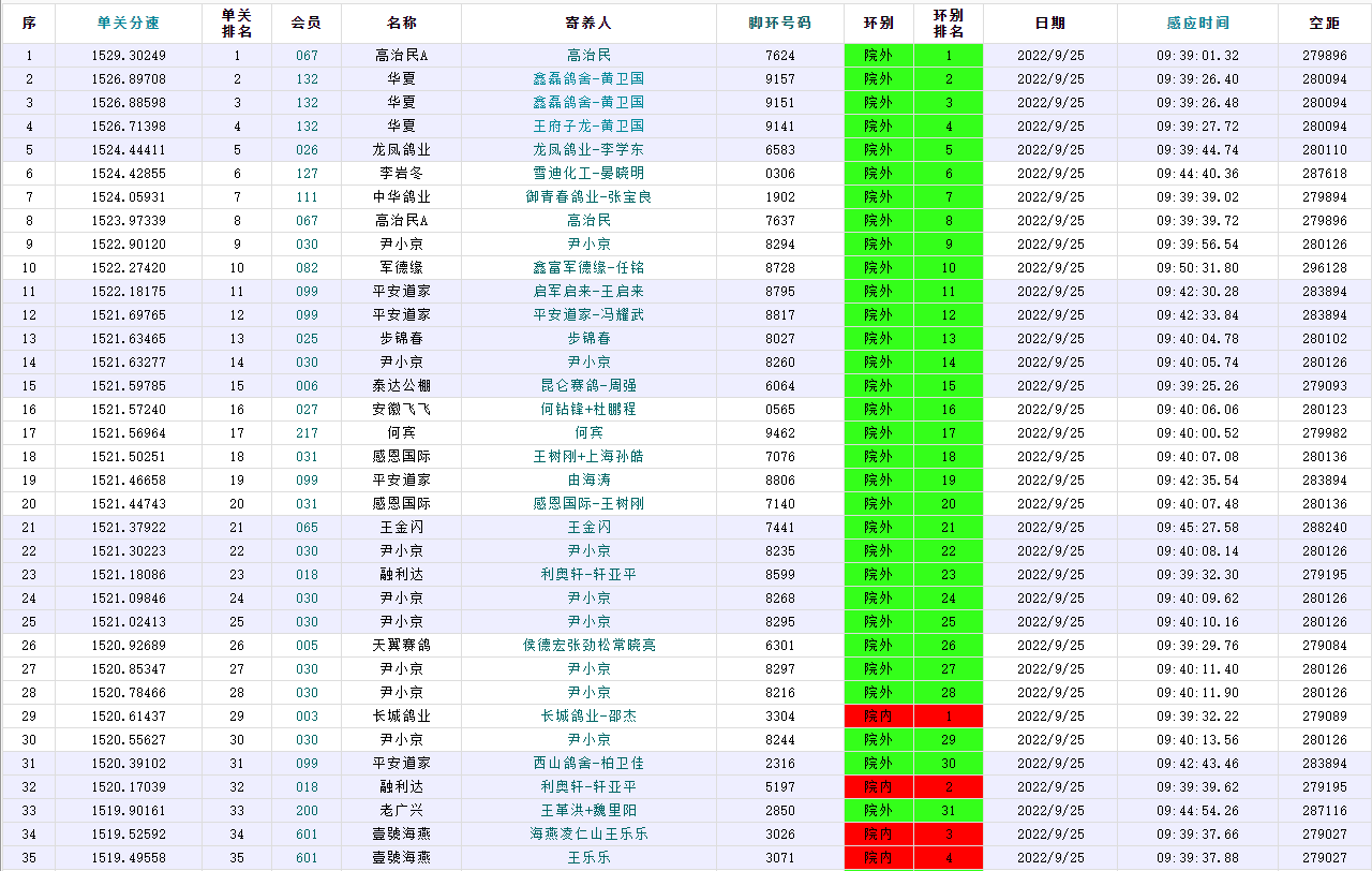 院外的竞争越发激烈,院内的战火也在燃烧。上午9:39:32,长城鸽业-邵杰环号3304的赛鸽踏响鸽钟,以1520.61437米/分的成绩拿下院内1位,同时列资格赛全场29位;利奥轩-轩亚平环号5197的赛鸽以微弱差距列院内2位,全场32位,平均分速1520.17039米/分;院内3名被海燕凌仁山王乐乐的爱将拿下,分速1519.52592米/分。