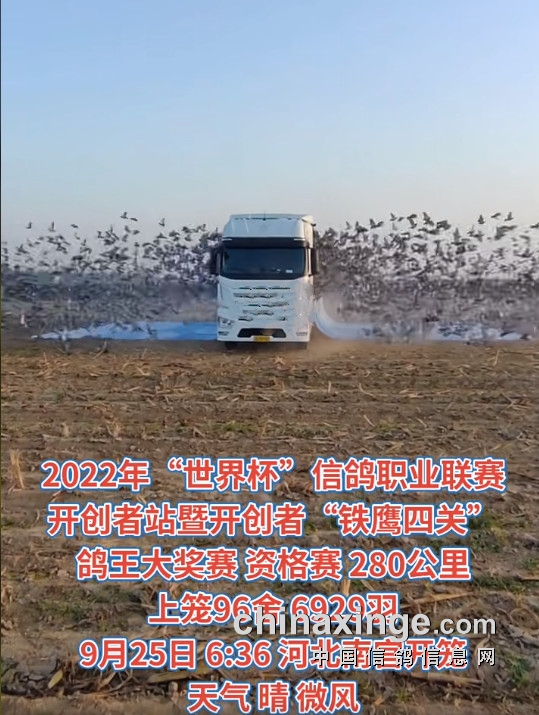 养鸽一年,用鸽一日,今朝一战乾坤定。9月25日早上06:36,开创者(北京)国际赛鸽俱乐部“铁鹰四关”鸽王大奖赛资格赛在河北省南宫擂响战鼓,96家鸽舍6929羽参赛鸽如同雄鹰展翅,一飞冲天,朝着家的方向飞去。参考空距280公里,放飞地天气晴朗,微风,适宜飞行。